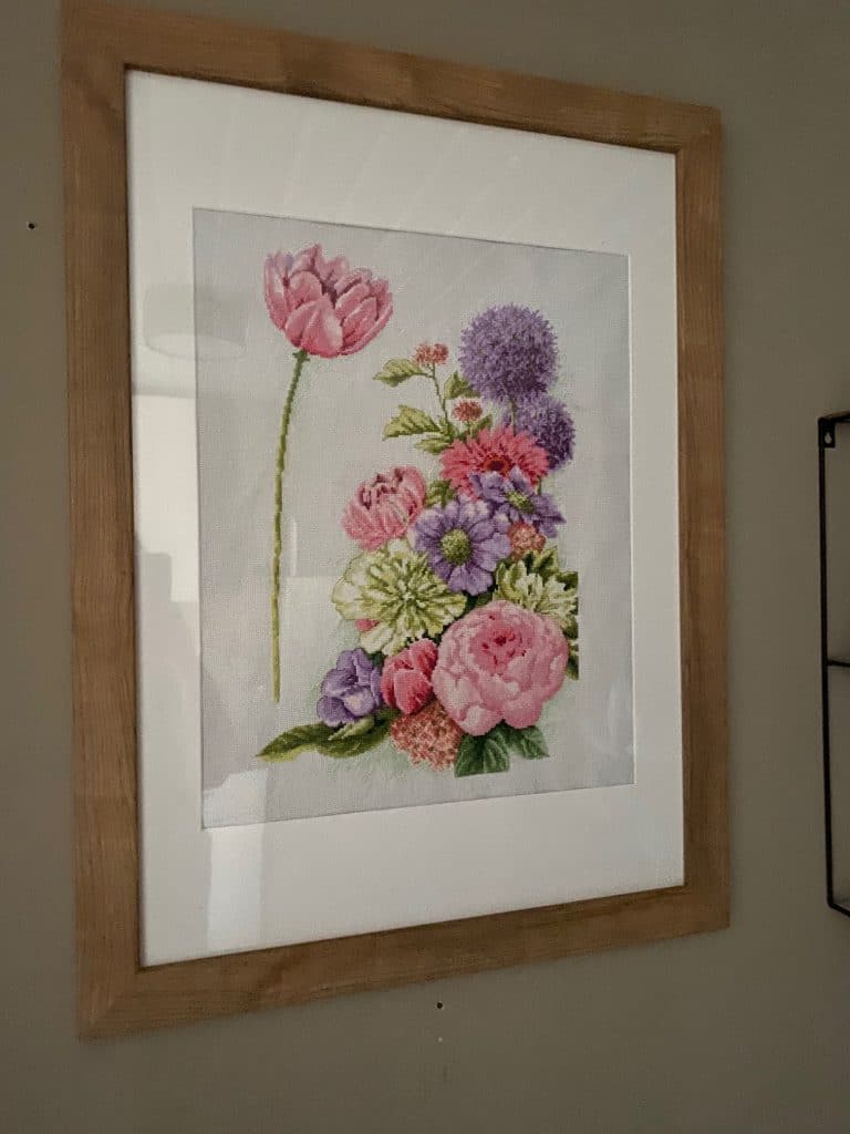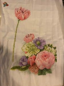 Het patroon is geborduurd op witte 14 CT aïda met DMC kleuren. De kleurnummers zijn onbekend. In totaal zijn er 36 kleuren gebruikt. Ik heb kruissteek, halve kruissteek en spansteken gemaakt. Het heeft een afmeting van 32 x 48 cm.